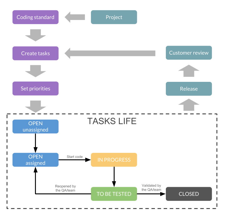 5 - When a task is completed it’s tested by another team that closes or reopens it.