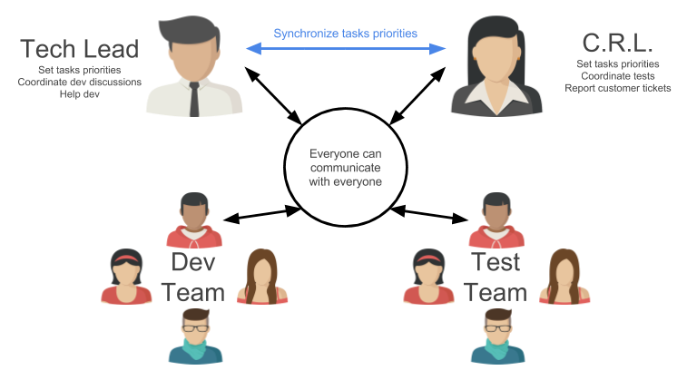 C.R.L. (Customer Relationship Lead): The CRL works with the Tech Lead to define the task prioritization. He communicates with the client and organizes the tests.